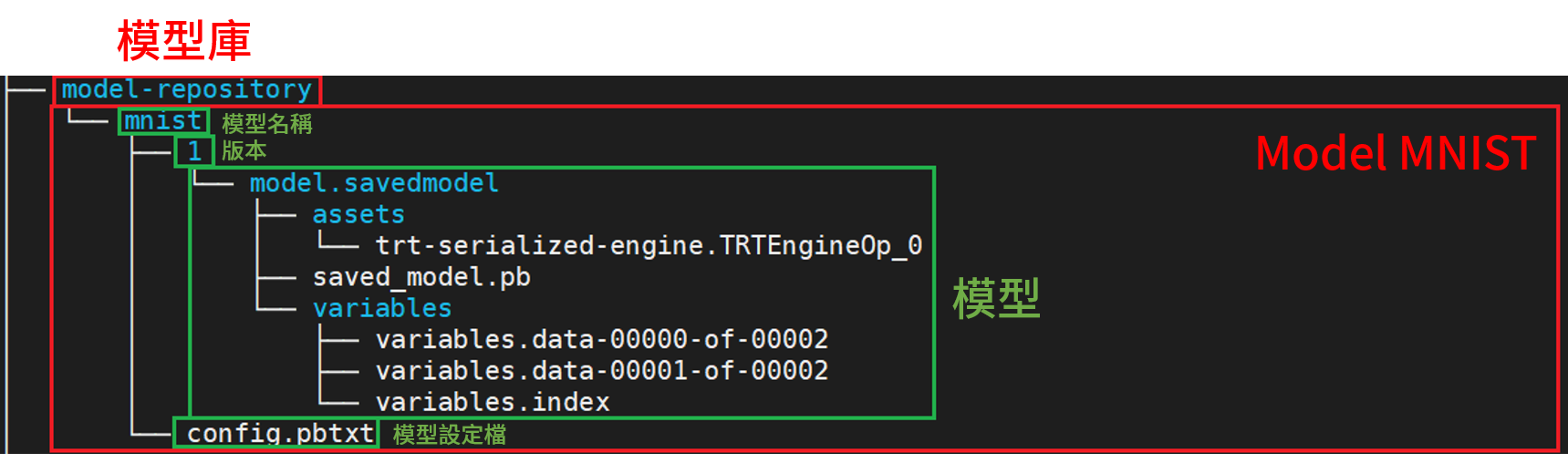 其中以 mnist-tftrt 模型包為例,mnist-tftrt 為此模型的命名,資料夾中存放了版本 1 的模型及設定檔。