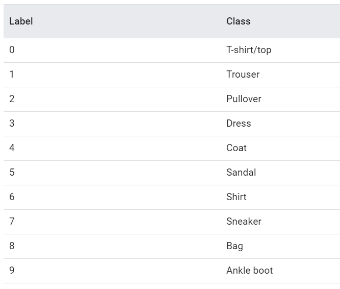 1 2 3 4 5 6 7 8 9 10 T-shirt/top Trouser Pullover Dress Coat Sandal Shirt Sneaker Bag Ankle boot